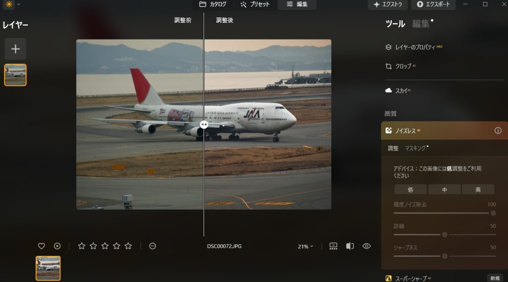プリセットの処理の他に、さらにノイズを消すことも可能。